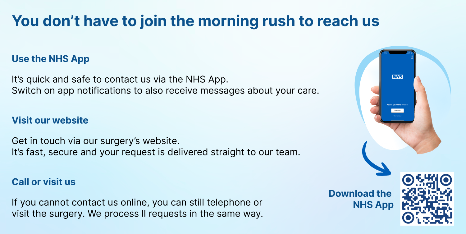 From 1st October 2025, all GP Practices in the UK must follow new requirements set out in the GP Contract. The Total Triage System is a new approach to managing patient GP appointment requests at the practice, designed to ensure everyone receives the care they need in a timely, efficient, and safe manner. Instead of traditional walk-in or phone booking methods, all GP appointment requests are now initially assessed—”triaged”—by our team before an appointment is scheduled. This process helps us to prioritise urgent cases, direct patients to the most appropriate healthcare professional, and make the best use of our resources.